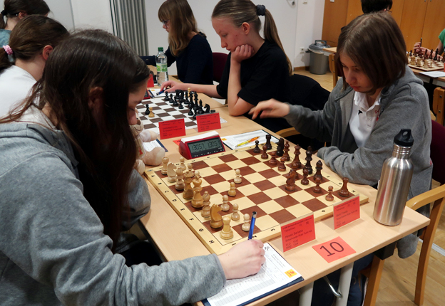 Schwerere Aufgaben hielt die 2. Runde vor allem für die „Kleinen“ bereit. Und so fand mein Höhepunkt der 2. Runde im Spielsaal der AKs u10w, u10m und u12w statt. Es war die Partie zwischen Luisa Winkler und Alina Dobrynina (USC Magdeburg). Es war eine kampfbetonte, angriffslustige Partie „in der sich beide nichts geschenkt haben“ (Martina Dannies). Es war von Anfang an „Feuer drin“. Die Magdeburgerin begann sehr aggressiv und so hatte Luisa auch einige Male wohl auch etwas Glück. Sie verteidigte sich umsichtig, hatte schnell drei Bauern mehr. Doch Alina setzte mutig weiter alles auf Angriff. Doch vielleicht wollte die Spielerin von USC zu viel, Luisa opferte einen Turm gegen Springer und Läufer, fand im 24. Zug einen Spieß zwischen Dame und Turm und sah auch weitere Drohungen. Es war trotzdem spannend und fesselnd, einer Spitzenpaarung würdig. Kompliment an beide für so viel Mut und Coolness. Am Ende stand ein Turmendspiel, aber auch das war nicht langweilig, weil Alina, im 41. Zug, noch eine Pattfalle aufstellte. Luisa zog den Läufer lieber weg und so konnte sie im 46. Zug, nach zwei Stunden (!!) endlich jubeln. Nur der Trainer hatte einige grauen Haare mehr.