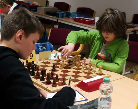 Vorher hatte ihr Bruder gegen Vinzent Werther (SV Saalespringer Halle) mit etwas Mühe gewonnen. Weniger Mühe hatte in der AK u14m Julian Brückner gegen Lucas Fiedler (SG Einheit Staßfurt) nach Leichtfigurengewinn im Bauernendspiel.