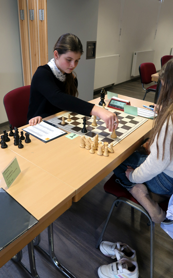 Anders Martha Börner in der AK u12w. Sie gewann am Vormittag zunächst gegen Lena Jennrich (SG Einheit Staßfurt). Hier gewann sie im 18. Zug die Qualität und dominierte dann klar die Partie bis zum Matt im 34. Zug.